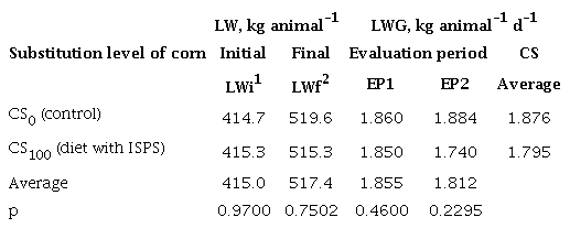 The weight of hot carcass was not affected for the CS (p = 0.6921) with average of 272.4 and 266.5 kg animal-1 for zero level and 100% of substitution, respectively, result that validate the effect recorded when using ISPS in the weight and gain of LW at finishing.