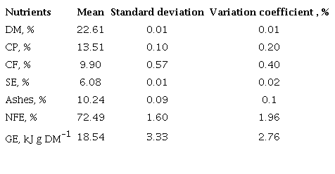 Determination of the chemical components of guava fruit silage. The chemical components of the silage were determined in the Bromatology Laboratory from Universidad Estatal Amazónica. For that three random samples of 1kg of the silage were taken, from the micro-silos of eight days post-elaboration. The time of the chemical characterization was established in function of Rodríguez (2008) and Lezcano et al. (2014) suggestions. In the fermented food was determined the dry matter (DM), crude fiber (CF), ash, crude protein (CP), ether extract (EE) and nitrogen free extract (NFE), according to the AOAC (2005) recommendations . The gross energy (GE) was determined in an adiabatic calorimetric pump, Parr brand, model 1241, from United States. All the analyses were made in triplicate.
