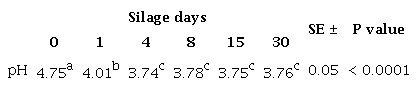 The highest pH value was showed in the moment of the micro-silos elaboration (day zero) and was slightly decreased in 0.74 units towards the first day the fermentation process have been start. Among the 4 and 30 evaluation days, the pH was established in values lower to 4, without significant differences among the mentioned days. The results of the pH analysis in the ripe guava fruit silage are shown in table 3.