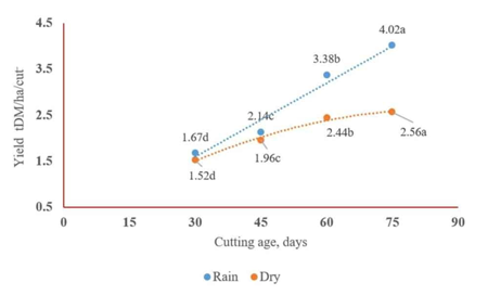 The yield during both season of the year (figure 1) had increases in accordance the plant maturity advance, with significant differences for p<0.05, among all the ages under study, with the highest results at 75 days of 4.02 and 2.56 tDM/ha/cut and increases of 2.35 and 1.54 tDM/ha/cut (58.46 and 40.62 %) for the rainy and dry season, respectively.