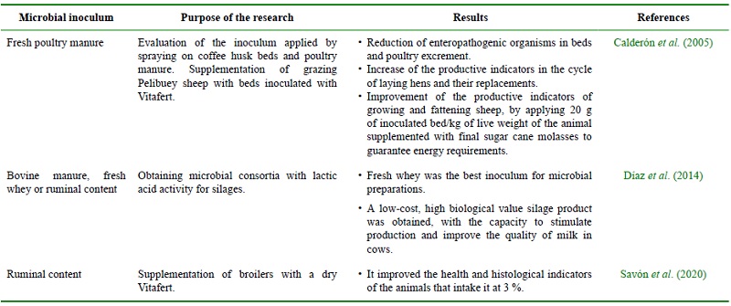 García et al. (2008) carried out the first studies on the dynamics of fermentation of excreta from broilers and laying hens, the main microbial inoculants for obtaining Vitafert, the first variant used. These researchers mainly focused on the proposal to improve the quality of the additive and the benefit of the products derived from mixed fermentation, such as lactic acid and other organic acids. These fermentation processes potentially eliminated pathogenic microorganisms. Regardless of the obtained results, poultry manure was no longer used in Cuba as inoculum for reasons of biological safety.