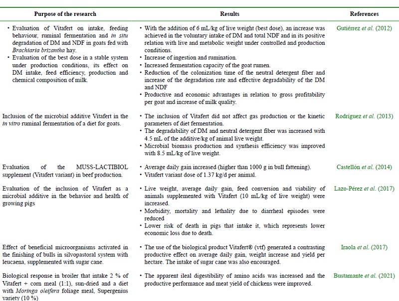 In most of the researchers, where Vitafert was applied in its different formulations and technological variants, improvements were obtained in the indicators evaluated in the animals that intake it or in the quality of the plant materials where it was applied. The microorganisms present in Vitafert and its metabolites are considered to have been able to promote the absorption of nutrients, strengthen the barrier function of the intestinal mucosa, improve the balance of the intestinal microbiota, promote the growth of beneficial microorganisms, inhibit the growth of pathogens and modulate immunity. However, the effectiveness of the zootechnical additive depended on its chemical and microbiological composition, the dose, mode and frequency of application, as well as the species or category of animal that intake it.