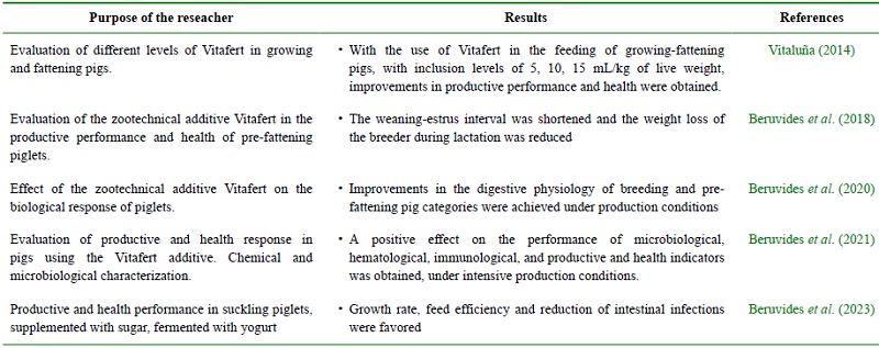 The introduction of natural yogurt to obtain Vitafert gave the zootechnical additive a high concentration of metabolites during fermentation, due to its content of lactic acid bacteria. This formulation was obtained as a safer alternative to previous biological inoculants. Table 2 shows the different researchers carried out with Vitafert, made with yogurt as inoculum, in ruminant and monogastric animals, obtained not only under laboratory conditions but also under production conditions.
