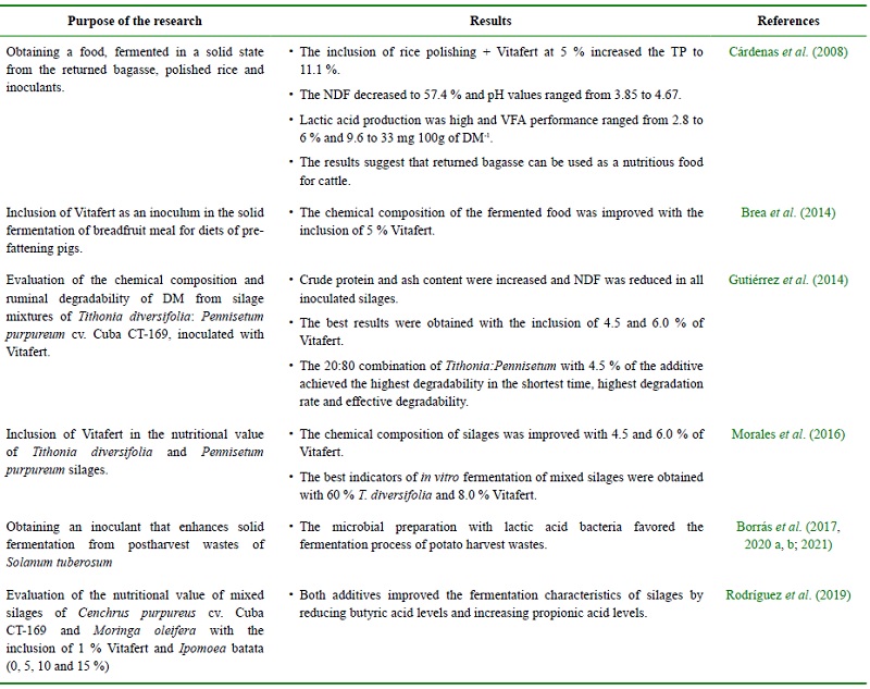 In Cuba, at the end of the 1990s, the Instituto de Ciencia Animal (ICA) developed a microbial preparation called Vitafert, composed of lactic acid bacteria, yeasts, organic acids and other metabolites. A large number of researchers describe its use as a zootechnical additive and show its ability to control the development of enterobacteria, reduce the incidence of diarrhea, increase live weight gain and increase energy and nitrogen retention in different species of productive animals (García et al. 2008, Bustamante et al. 2016, Savón et al. 2020 and Beruvides et al. 2021). In addition, technological variants were used which were differed in the form of presentation, the inoculum and raw materials used in their preparation (Bustamante et al. 2016 and Beruvides et al. 2021). This review mainly deals with the aspects related to the process for the development of this additive, which includes microbial inoculants, percentages of raw matters used, the production process, technological variants and its use in the agricultural sector.