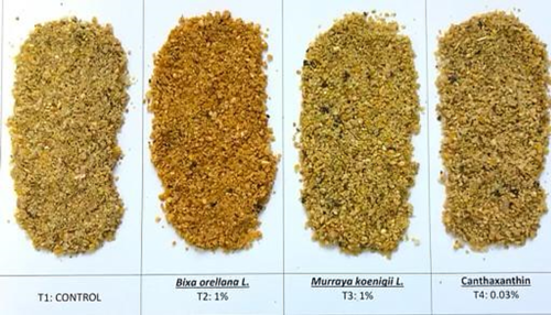 The European Union and other countries have limited the use of synthetic pigments; thus, nutritionists are looking for natural pigments for animal production (Pertiwi et al. 2022). Likewise, some natural pigments also have a phytobiotic function, since they are rich in secondary metabolites that, in low concentrations, have a positive productive response. Among the natural pigments initially proposed for laying hens are Bixa orellana and Murraya koenigii (Franco and Gomez 2022). Previous experiments indicated that the use of up to 1.5% Bixa orellana in hen diets markedly pigmented yolk color and improved albumen height and Haugh unit (Martínez et al. 2021a), as well as a study in broilers, indicated improvements in feed efficiency and edible portions (Moncayo and Ramírez 2020), related to the high concentration of bixin and norbixin in the seed powder of this pigment. Also, Murraya koenigii has been used daily in human food as a pigment/seasoning for its flavor and aroma (Tabashiri et al. 2022); however, few studies have been carried out to verify its effect on skin pigmentation in poultry.