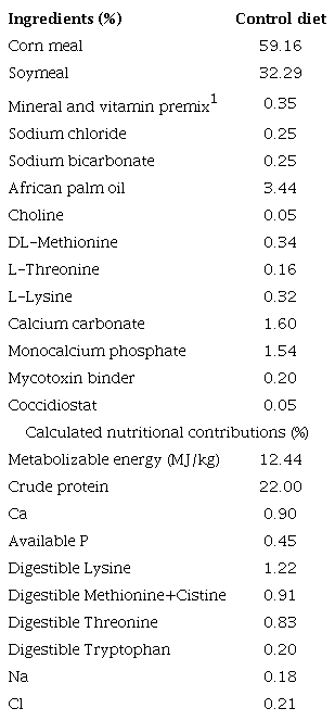 A total of 480 Ross 308® male chickens from birth to 10 days old, were randomly assigned to metabolic cages (0.70 m wide x 1.0 m long and 14.29 birds/m2) in four treatments (four replicates and 30 birds per replicate). The experimental diets consisted in a control diet (CD), CD+1 % achiote (Bixa orellana), CD+1 % curry (Murraya koenigii) and CD+0.03 % canthaxanthin. Temperature and lighting were controlled daily. Previous studies (Moncayo and Ramirez 2020, Sharma et al. 2021, Bonamigo et al. 2022 and Franco and Gomez 2022) were taken as references for the dietary inclusion levels of pigments. Diets were formulated following Ross 308 requirements (table 1 and photo 1). The pigments used were acquired in the company "Alimento", Honduras. Feed and water were offered ad libitum in linear feeders and nipple drinkers, respectively. Initial and final body weights (IBW and FBW), as well as feed intake (FI) were measured to determine the feed conversion ratio (FCR).
