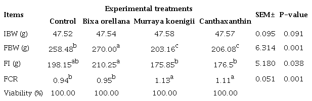 The experimental diets did not change (P>0.05) the viability in the first 10 days old of broilers (table 2). However, the dietary supplementation with Bixa orellana increased (P<0.05) the body weight compared to the other treatments. Furthermore, diets with Murraya koenigii and canthaxanthin decreased feed intake, which provoked the highest feed conversion ratio (table 2, P<0.05) in relation to the control and Bixa orellana groups.
