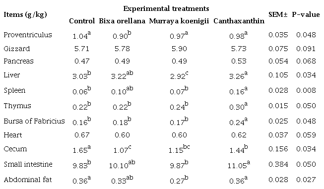 In addition, the Bixa orellana group decreased (P<0.05) the relative weight of the proventriculus and cecum, although, the latter organ (cecum) without significant changes (P>0.05) with the Murraya koenigii group. Likewise, this natural pigment (Murraya koenigii) decreased (P<0.05) the relative weight of abdominal fat and liver in relation to the control, canthaxanthin and Bixa orellana treatments, respectively. The relative weight of the gizzard, pancreas, and heart did not change due to the experimental treatments (P>0.05).