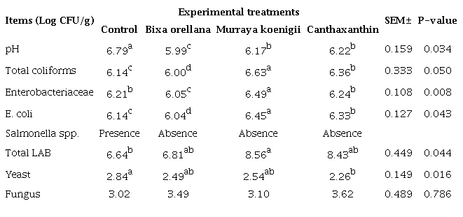 The effect of natural and synthetic pigments on cecal traits of young broilers is shown in table 4. The diets with the pigments decreased cecal pH, with a higher emphasis in the group with Bixa orellana which provoked a reduction (P<0.05) of total coliforms, Enterobacteriaceae and E. coli in relation to the control diet and the other groups of pigments. Likewise, cecal Salmonella spp. of broilers fed with the proposed pigments was not found (table 4). On the other hand, the Murraya koenigii group increased (P<0.05) the population of lactic acid bacteria and the canthaxanthin group decreased (P<0.05) the quantification of cecal yeasts compared to the control diet. Also, the experimental diets did not change (P>0.05) the population of cecal fungus (table 4).
