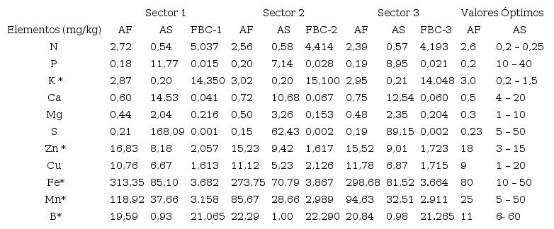 Esta información es clave para determinar un diagnóstico oportuno, ya que la tasa de absorción y distribución varía según las sustancias nutritivas aplicadas o encontradas en el suelo. El muestreo continuo permite planificar, orientar y sustituir fertilizantes para lograr una nutrición adecuada (de Deus et al., 2018). Motivo por el cual se cuantificó el factor de bioacumulación de elementos para determinar la capacidad de absorción de la planta sobre la cantidad de nutrientes presentes en el suelo cultivable (El-Amier et al., 2017). El factor de bioacumulación fue calculado a partir de la cantidad del elemento absorbido por la planta, dividido entre la cantidad del elemento presente en el suelo (Maldonado-Magaña et al., 2011).