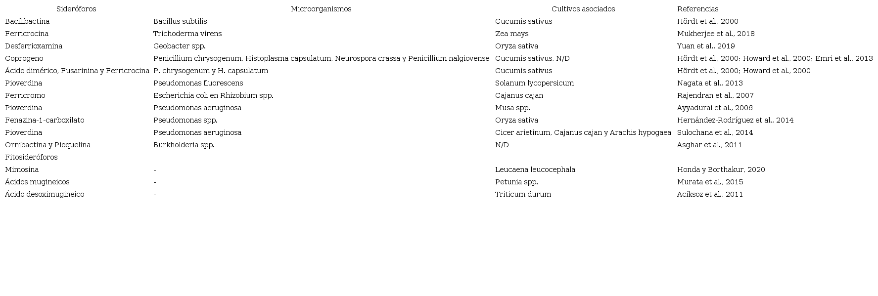 En las plantas de banano la enfermedad moko es regulada de forma distinta por la síntesis de sideróforos (Ailloud et al., 2016), por tanto, el Fe puede desempeñar un papel importante proporcionando resistencia contra los patógenos (Herlihy et al., 2020). Un caso particular, es el hongo Alternaria alternata, que utiliza dos sistemas sideróforos para la adquisición de Fe, debido a que la disponibilidad y el metabolismo del Fe están íntimamente relacionados con su desarrollo y virulencia (Voß, 2020). En el caso de bacterias, el sideróforo conocido como pioverdina es sintetizado por Pseudomonas, contribuyendo a un mayor crecimiento y rendimiento de cultivos de importancia comercial (Sulochana et al., 2014) (Tabla 3).