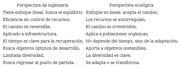 Interpretar las características de la resiliencia desde la perspectiva sistémica es importante, por tanto, es preciso comprender el campo de acción de la resiliencia desde el punto de vista de la ingeniería y la ecología, sobre todo, si se persigue avanzar en el debate científico y el desarrollo del conocimiento (Tabla 1).