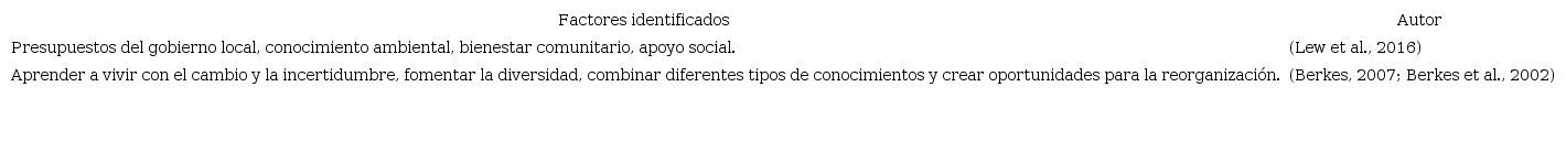 No son indicadores, sino estimadores cualitativos coherentes de las características abstractas de la resiliencia, de tal forma que ayudan a los usuarios, si la desconocen, a entender la capacidad de la resiliencia o a recibir la misma información de una evaluación (Carpenter et al., 2005). En la Tabla 2 se distingue ejemplos de factores de resiliencia que actúan como elementos intermediarios entre los elementos del sistema socio-ecológico y las variables interpretativas de resiliencia.