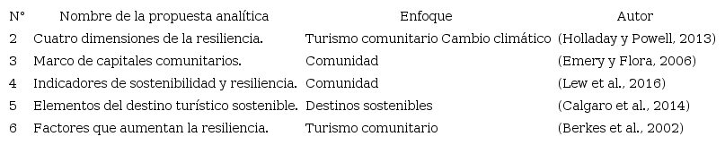El turismo centró su atención en explicar, a través de marcos metodológicos, la manera de operar la sostenibilidad. No obstante, surgió el pensamiento de evaluar al turismo desde la perspectiva de resiliencia socio-ecológica, convirtiéndose en una experiencia nueva y emergente (Becken, 2013; Biggs, 2011; Lew, 2013). Con la revisión de la literatura se encontraron doce estudios, cuyas propuestas de marcos teórico-metodológicos (ver Tabla 3) demostraron el uso del proceso de evaluación de la resiliencia con distintos fines: investigar los impactos del turismo, diferenciar indicadores medibles entre sostenibilidad y resiliencia, destacar las dimensiones y dominios de la resiliencia en el turismo, observar principios para desarrollar resiliencia, ponderar las capacidades colaborativas como estrategia de resiliencia y determinar los factores que aumentan la resiliencia. El esquema común fue presentar una dimensión superior donde se alojan elementos fijos, los cuales conducen a representar dinámicas, indicadores, medidas o acciones, en vista del análisis y la representación de una situación real y en constante actualización.