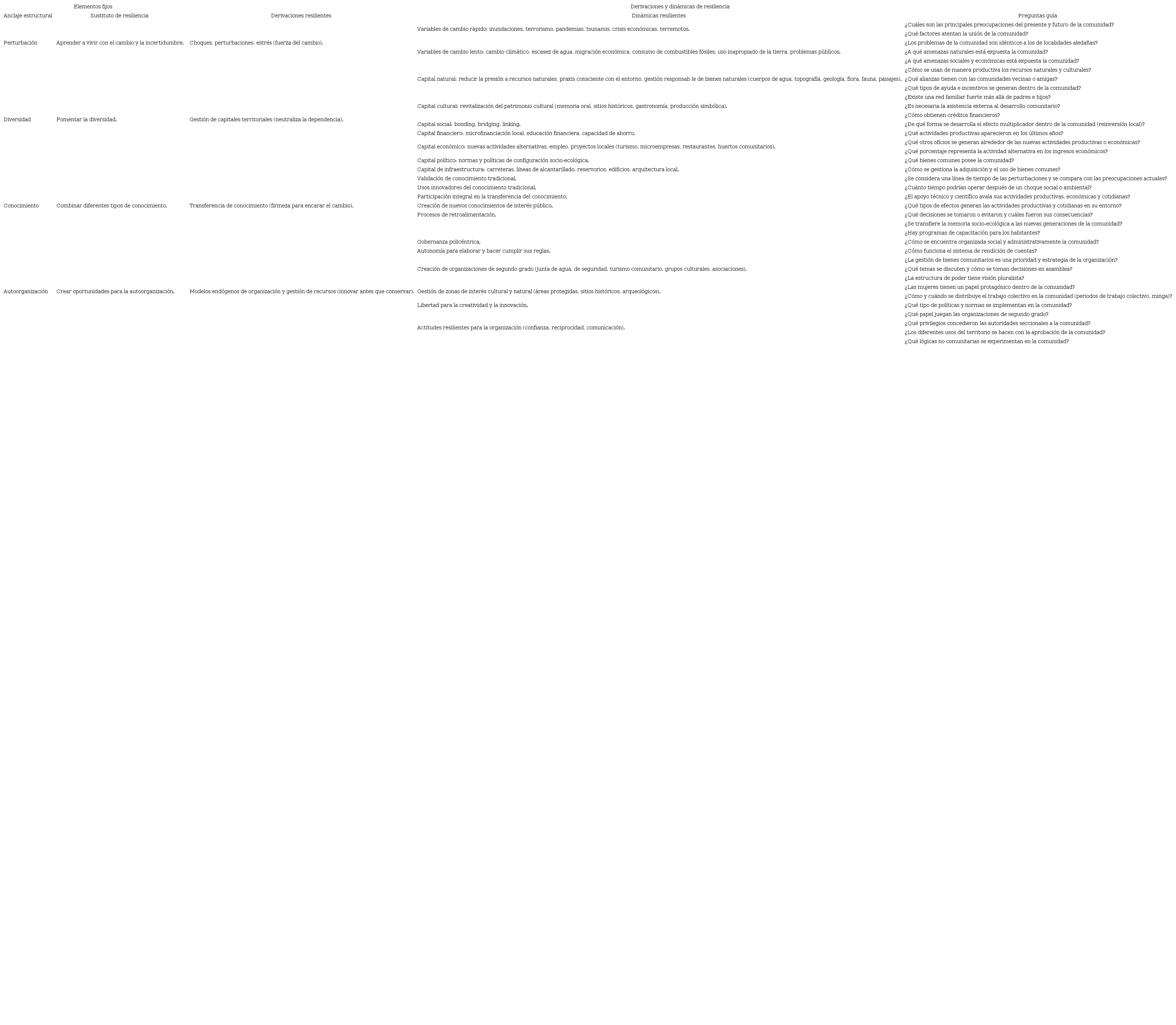 La perturbación, la diversidad, el conocimiento y la autoorganización son elementos que tienen la particularidad de ser permanentes dentro de cualquier estado del sistema y estar sometidos a desafíos de resistencia y adaptación. Para la presente propuesta, actúan como anclajes estructurales, tienen la función de conectar los factores de resiliencia con las dinámicas que la aumentan o la disminuyen. Es decir, son puntos estratégicos donde se desarrolla el proceso de adaptación y transformación del estado del sistema.