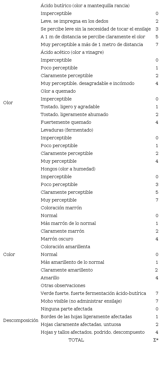 Los análisis bromatológicos se realizaron en el Laboratorio de Nutrición Animal de la Facultad de Ciencias Agrícolas de la Universidad Central del Ecuador, donde se analizaron las características organolépticas con la ayuda de un sistema de puntuación (Tabla 1) creado por la Sociedad Alemana de Agricultura (DLG), con la finalidad de clasificar al ensilaje como muy bueno, bueno, regular, malo o muy malo, con base en la puntuación final obtenida.