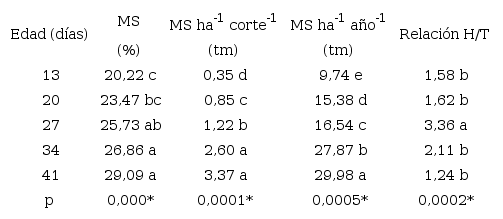 * Significación estadística de p al 5 % Nota: Los resultados que tienen la misma letra no tienen diferencia significativa.El rendimiento (MS ha-1 corte-1) estuvo determinado por la edad del pasto, aumentando aproximadamente 10 veces el peso, de 0,35 t ha-1 corte-1 a los 13 días hasta 3,37 t ha-1 corte-1 a los 41 días (Tabla 2). Así mismo, la relación H/T aumentó con la edad hasta los 27 días, donde alcanzó el valor máximo (3,36 %) y disminuyó en edades de 34 (2,11 %) y 41 (1,24 %) días, presentando una diferencia estadística significativa entre el tratamiento de 27 días con respecto a los demás (Tabla 2).