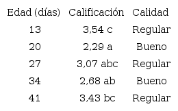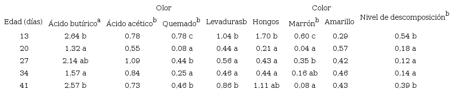 El ANOVA determinó que las características organolépticas variaron de acuerdo con la edad en la que el pasto fue ensilado, excepto por “olor ácido acético” y “color amarillento”, que no presentaron diferencias significativas. Sin embargo, estas diferencias no se reflejaron en la puntuación, por lo que, en general, todas las medias de los tratamientos comparten la misma calificación, excepto los olores a ácido butírico y levaduras (Tabla 3).