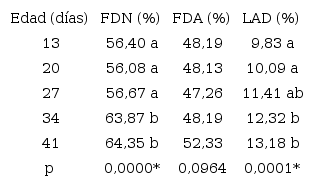 Al finalizar este estudio, la fibra detergente neutro (FDN) aumentó con la edad y marcó dos grupos bien definidos por la diferencia estadísticamente significativa: el primero conformado por los tratamientos de 13 a 27 días (56,08 % a 56,67 %) y el segundo por los de 34 y 41 días (63,87 % y 64,35 %). En cambio, la fibra detergente ácido (FDA) no presentó diferencias significativas entre tratamientos, mientras que la lignina ácido detergente (LAD), aumentó con la edad, presentando una media de 9,83 % a los 13 días y de 13,18 % a los 41 días, existiendo diferencias significativas entre los tratamientos de 13 y 20 días con respecto a los de 34 y 41 días; el tratamiento de 27 días no tuvo diferencia con ningún otro tratamiento (Tabla 6).