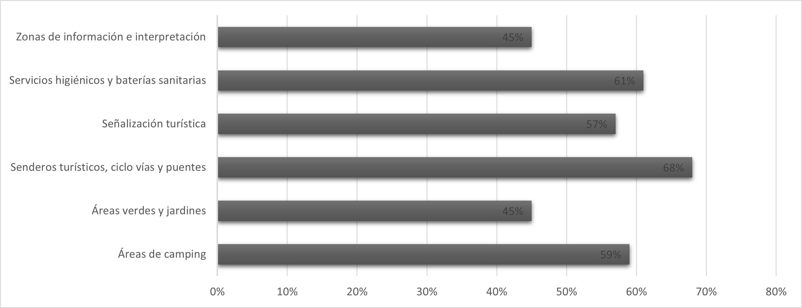 En cuanto a la infraestructura turística relacionada con las facilidades en las áreas naturales protegidas y sus zonas de amortiguamiento, los turistas requieren el mejoramiento de los senderos turísticos, ciclovías y puentes en el 68 %, servicios higiénicos y baterías sanitarias con el 61 %, áreas de camping en el 59 %, señalización turística con el 57 %, las áreas verdes, miradores y zonas de información e interpretación con el 45 % (Figura 9).