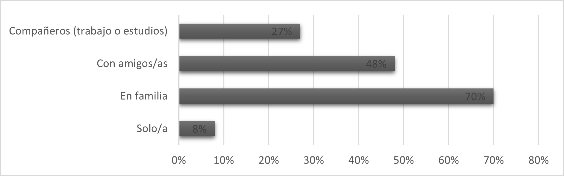 Se estableció el perfil de los visitantes que llegan a las áreas naturales protegidas, el cual está determinado por la procedencia de las personas encuestadas en las cuales predomina la nacionalidad ecuatoriana con el 97% y el 3% corresponde a extranjeros. En cuanto a la edad predomina el rango de 19 a 35 años con el 71%, seguido de 23% de 36 a 50 años y el 6% en el rango de 51 a 75 años. Cuando las personas visitan estos sitios, sus viajes los realizan con la familia en el 70 % de los casos, con amigos/as el 48,5 %, seguido de compañeros (trabajo o estudios) con el 27 % y solos el 8 % (Figura 3).