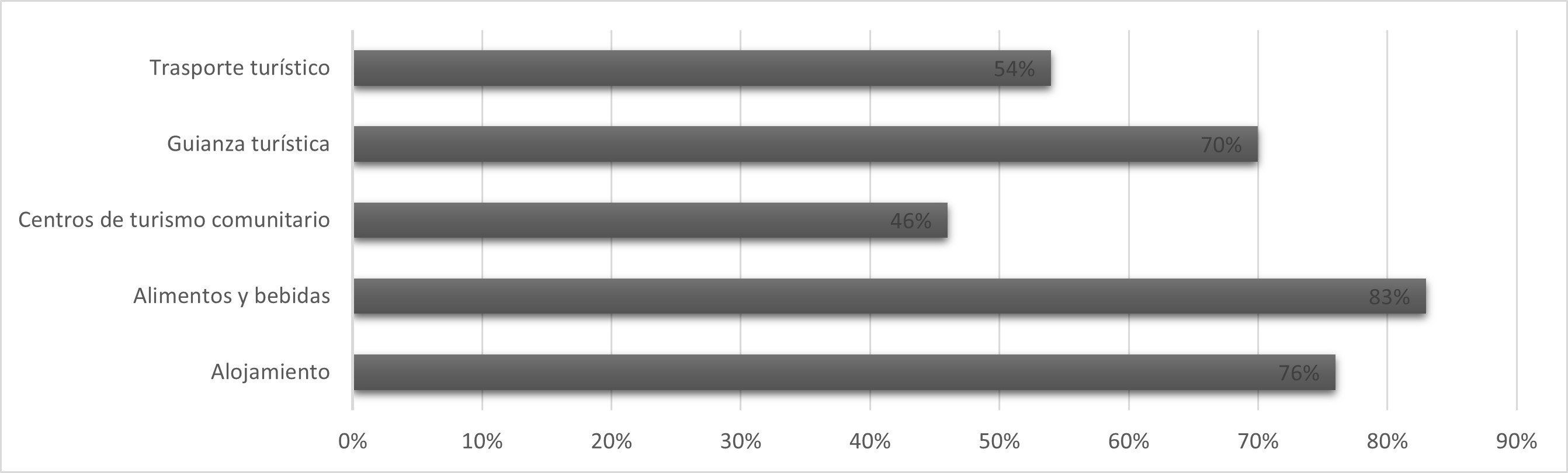 En cuanto a la infraestructura de servicios turísticos que van a requerir cuando visiten las áreas naturales protegidas y sus zonas de amortiguamiento predominan los establecimientos de alimentos y bebidas en el 82,5 %, alojamiento con el 75 %, seguido de guianza turística el 70 %, el trasporte turístico el 53 %, y finalmente los centros de turismo comunitario con el 43 % (Figura 5).