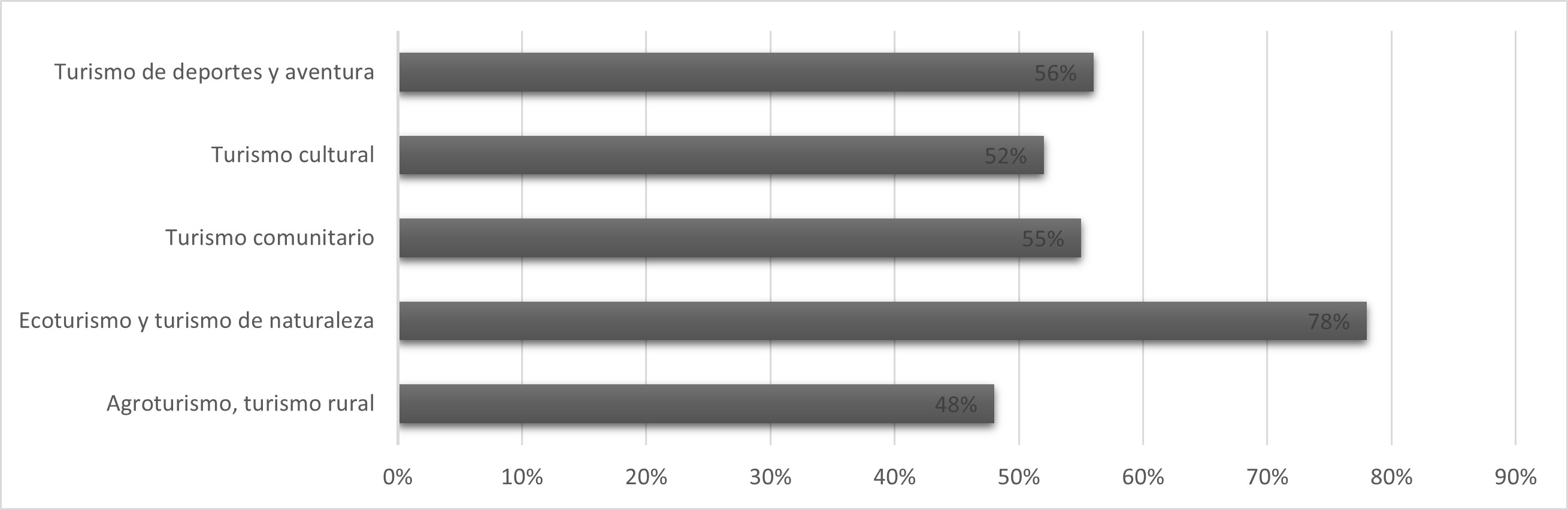 En la selección de las líneas de productos turísticos que prefieren en las áreas naturales protegidas y sus zonas de amortiguamiento, se hace énfasis en el ecoturismo y turismo de naturaleza con el 78 %, el turismo de deportes de aventura en el 56 %, seguido del turismo comunitario con el 55 %, el turismo cultural con el 52 %, finalmente con el 47 % prefieren el agroturismo y turismo rural (Figura 7).