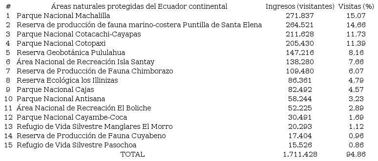 Table 1. The 15 most visited natural protected areas in continental Ecuador in 2019.