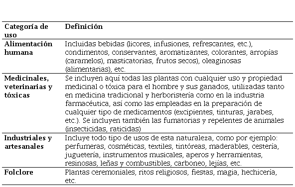 Nota: Adaptado de Biodiversidad y etnobotánica en España de Morales Valverde et al. (2011)Se analizó descriptivamente el porcentaje de las familias y especies más representativas dentro de cada una de las categorías. Para determinar el valor cultural de una especie se utilizó el Índice de valor de uso (IVUs) (ecuación [1]) aplicado por Cogollo Calderón y García-Cossio (2012), que se establece de acuerdo con el grado de consenso en las respuestas de los informantes, con respecto a la utilidad de una especie. Este índice se estimó utilizando la expresión: