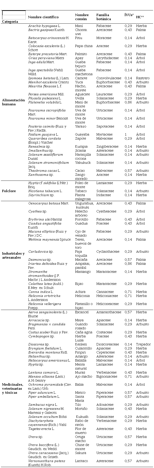 Los valores de uso (IVUs) más altos corresponden a Psidium guajava (1), Mauritia flexuosa (0,85), Plukenetia volubilis (0,85), Canna indica (0,71) y Heliconia ortotricha (0,71) (Tabla 2). La parte más usada son las hojas, las afecciones más tratadas son dolores estomacales, la aplicación más representativa es el antiséptico para lavar heridas y cicatrizante. Las formas de empleo más comunes son: cocciones, baños, emplastos e infusiones.