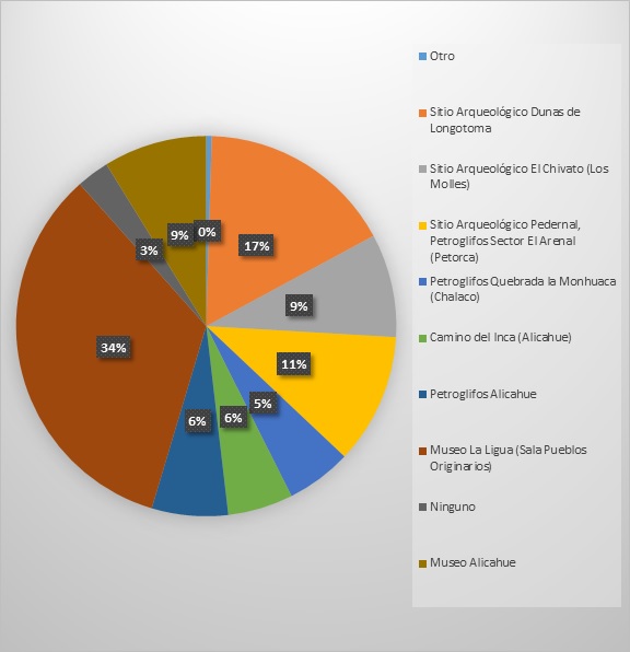 Los resultados arrojan una mayoría de visitas al museo de La Ligua (Figura 8), que concentra una cantidad importante de bienes arqueológicos locales, además de otros recursos culturales. Luego, las Dunas de Longotoma son mencionadas también como sitio reconocido y visitado. En tercer lugar están los petroglifos del sector El Arenal y luego se distribuyen otros sitios con menor participación. Es importante mencionar que el museo de La Ligua, ubicado en la capital de la provincia, es un lugar público, ubicado en un centro urbano y con difusión permanente, por tanto es lógico la mención del mismo por sobre otros sitios y bienes que no tienen una estructura de gestión como recursos patrimoniales. Ahora bien, al ser consultados por aquellos sitios que les llaman la atención y que les gustaría conocer en su provincia, los resultados muestran una clara preferencia a los petroglifos y el Camino del Inca, relievando lo llamativos que son este tipo de recursos entre la comunidad, algunos de los cuales son señalados como “sin conocimiento” de su existencia entre los mismos habitantes locales.