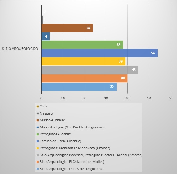 Al hacer referencia al conocimiento de la población provincial sobre el patrimonio arqueológico, por amplia preferencia el lugar con mayor reconocimientos y visitas lo obtiene el museo La Ligua. Esta notoria diferencia se debe, en parte, al tratarse de una organización amparada bajo una institucionalidad comunal, quien la dota de mayores herramientas y facultades para posicionarse como actor principal en el área arqueológica. El resto de sitios existentes dentro de la provincia registran valores relativamente cercanos. El sitio arqueológico Dunas de Longotoma, sin embargo, si bien no registra una clara distancia, destaca como el segundo sitio con mayor reconocimiento, posiblemente debido a un incipiente desarrollo turístico en el sector, dándole de este modo mayor difusión para su reconocimiento. En cuanto a la intención de los habitantes por visitar los sitios arqueológicos, los sectores interiores de la provincia y en especial los ubicados en el sector de Alicahue, comuna de Cabildo, son elegidos como los principales generadores de motivación para su conocimiento. La explicación más coherente para ello, se debe a un menor desarrollo turístico y puesta en valor del sector, disminuyendo las posibilidades de acceso, y por consiguiente generando desconocimiento dentro de la población