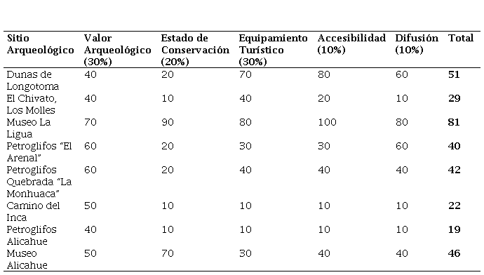 En una escala de 1 a 100, donde 1 es la más baja y 100 la calificación más alta, se evaluaron los ocho principales sitios ubicados en la provincia de Petorca. A su vez, se establecieron cinco categorías de evaluación con distintos valores de ponderación, correspondientes a su importancia para el desarrollo arqueoturístico, tanto en aspectos como el valor arqueológico y estado actual del recurso como las capacidades turísticas del sitio en general. Dichas categorías de evaluación ponderada son: