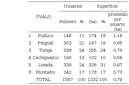 La superficie bajo riego de la acequia es de 1232 ha y el número de agricultores catastrados que hacen uso de estas aguas asciende a 1557. El mayor número de usuarios y área de riego se sitúan en los óvalos Tunga y Lozada; mientras que en los óvalos Pulluco y Cachiguayco, al tener influencia de la expansión urbana, registran cifras inferiores (ver Tabla 1).