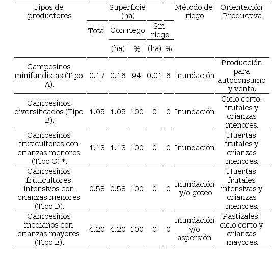 Los campesinos con menor acceso a la tierra y que poseen predios menores a 0.5 ha son catalogados como ?minifundistas? (Tipo A). También existen propiedades con extensiones de entre 0.5 y 2 ha, las cuales pertenecen a agricultores con orientación productiva diversificada y producción frutícola (Tipos B, C y D). Finalmente, existen productores con mayor acceso a la tierra (2-5 ha), que la valorizan principalmente con pastizales para la crianza de animales mayores y cultivos para la venta (Tipo E). La técnica de riego predominante es por inundación; sin embargo, existen explotaciones que usan sistemas de riego por aspersión y goteo, en productores con mayor acceso a la tierra o que han intensificado la producción frutícola ( Tabla 2).