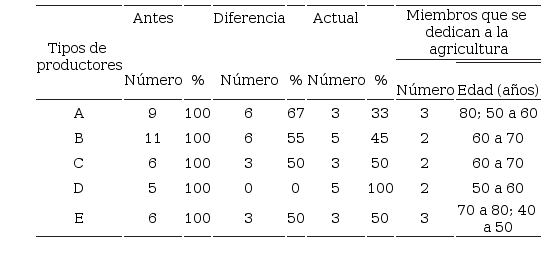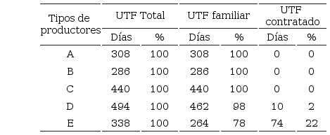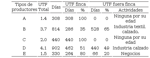Mientras los campesinos con mayor edad destinan la totalidad de la mano de obra para la producción predial (Tipos A y C), los productores con mayor disponibilidad de fuerza de trabajo (Tipos B y D), cuyos hijos son todavía jóvenes, se insertan en actividades no agrícolas como la industria textil, calzado o pequeños negocios ( Tabla 3). Caso particular constituyen los agricultores con mayor acceso a la tierra (Tipo E) que, a pesar de tener limitada mano de obra, destinan un apreciable porcentaje de tiempo para la gestión de pequeños negocios.