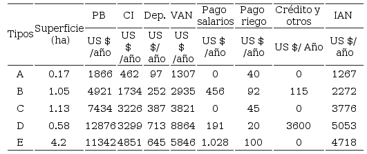 El ingreso agropecuario de un campesino se obtiene como resultado de la actividad agrícola de su explotación. En general, las remuneraciones de todos los tipos de productores son bajas, con un rango de entre US $ 1267 y US $ 5.000 por año ( Tabla 6). Sin embargo, existen diferencias en términos de disponibilidad de tierra y orientación productiva. Los agricultores con más bajos ingresos son los minifundistas (Tipo A), pequeños campesinos diversificados (Tipo B) y fruticultores (Tipo C). En contraste, agricultores con mayor acceso a la tierra, que han especializado su producción, obtienen una mayor remuneración (Tipos D y E).