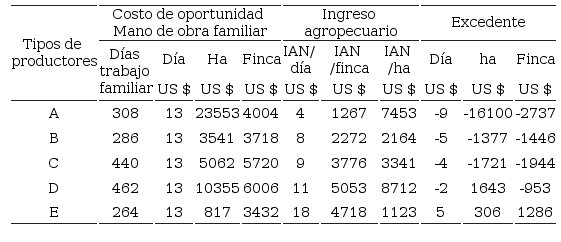 El excedente representa la ganancia resultante del trabajo en la finca. Para la mayoría de los campesinos, la labor invertida en el predio no permite obtener ganancias, situación que se agrava a medida que se reduce el tamaño de la explotación. En contraste, la tipología E, compuesta por agricultores con mayor acceso a la tierra y con orientación a la crianza de animales bovinos, constituye la única categoría que presenta excedentes, superando incluso en un 39% al valor promedio del costo de oportunidad en la zona ( Tabla 7).