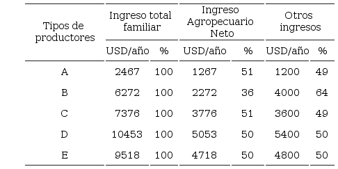 El ingreso generado por la actividad agropecuaria no satisface las necesidades familiares en la mayoría de los casos y, menos aún, permite realizar mejoras en la finca. Por tal motivo, la obtención de otros ingresos vinculados o no con la agricultura es inevitable para garantizar la manutención de la familia. Los principales rubros se sitúan en pensiones por jubilación, bono de desarrollo humano y pequeños negocios. Además, cuando se dispone de mano de obra familiar, con una mayor actividad laboral (Tipo B y D), se inserta en la industria textil, de calzado o trasporte menor. En todos los casos, el ingreso no agrícola puede representar alrededor del 50% del ingreso familiar total ( Tabla 8).