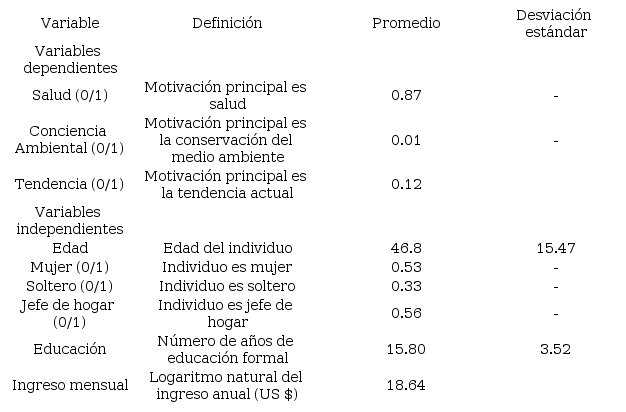 Como se refirió anteriormente, para el análisis se definieron las siguientes categorías de respuesta: salud, conciencia ambiental, estilo de vida y características del producto. Las variables dependientes de interés fueron cuatro variables dicotómicas, las cuales tomaron el valor de uno si una de las tres alternativas de empleo es la motivación principal o secundaria para el consumo de productos agroecológicos: