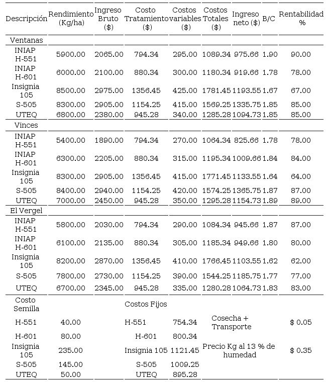 El híbrido S-505 presentó el mayor rendimiento en Vinces con 84 T/ha, a un costo de tratamiento de US $ 1154.25, un ingreso neto de $ 1365.75 y una relación beneficio/costo de 1.87, es decir, que por cada dólar invertido se ganó 87 centavos (rentabilidad del 87%). Sin embargo, el híbrido experimental UTEQ produjo la mayor rentabilidad con 89% a un costo de tratamiento de US $ 945.28, y un ingreso neto de US $ 1154.73.