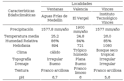 El trabajo de campo tuvo lugar en el periodo junio-septiembre de 2015, en tres localidades representativas del Litoral ecuatoriano: Ventanas, Valencia y Vinces, cuyas características edafoclimáticas se presentan en la Tabla 1.