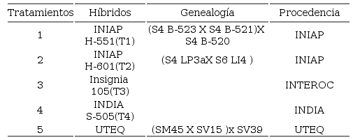 Para la evaluación comparativa con el nuevo hibrido experimental de maíz UTEQ, se utilizaron cuatro híbridos comerciales de maíz: el INIAP H-551, INIAP H-601, INDIA 505 y el Insignia 105. Las especificaciones de siembra utilizadas para este estudio se presentan en la Tabla 2.