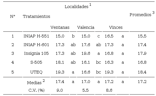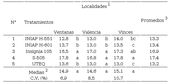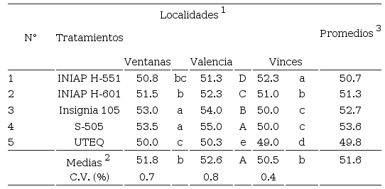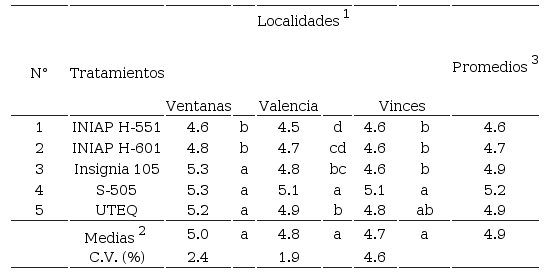 En la Tabla 4, se presentan los promedios correspondientes a los días a la floración masculina. El análisis de varianza reflejó que existieron diferencias significativas entre localidades, con coeficientes de variación de 0.7, 0.8 y 0.4 %, para Ventanas, Valencia y Vinces, respectivamente.