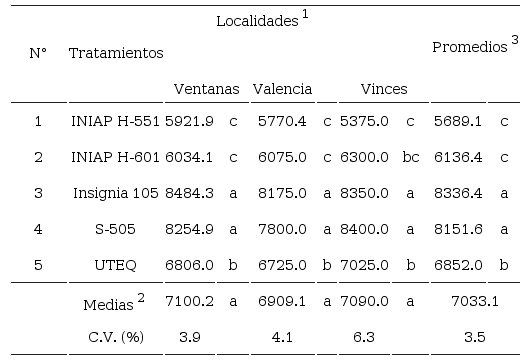 En Ventanas, los mayores rendimientos se registraron para los híbridos Insignia 105 y S-505, superando al híbrido UTEQ y los híbridos de INIAP. Similares resultados se registraron en las localidades de Valencia y Vinces. No se registraron diferencias significativas atribuibles a la localidad.
