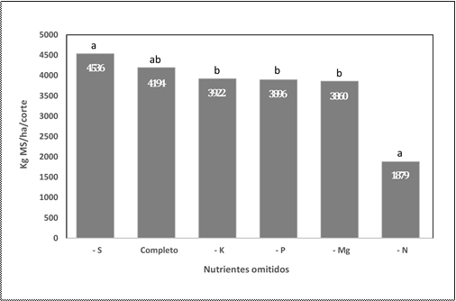 El efecto de la omisión de nutrientes en la producción de MS se presenta en la Figura 1 El tratamiento que omitió la aplicación de S y el que recibió todos los nutrientes (completo) fueron estadísticamente iguales y tuvieron los mayores rendimientos promedio por corte (4536 y 4194 kg MS/ha/corte, respectivamente). Los tratamientos con rendimientos intermedios e iguales estadísticamente fueron aquellos en los cuales se omitió la aplicación de K, P y Mg (3922, 3896 y 3860 kg MS/ha/corte, respectivamente). Finalmente, el tratamiento de menor rendimiento fue aquel en el que se omitió N con 1879 kg MS/ha/corte.