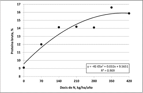 Se ha demostrado que en condiciones no limitantes de humedad y de otros nutrientes, la fertilización con N aumenta la concentración de N total y de proteína bruta (PB) en la biomasa de las gramíneas ( Whitehead, 1995). En este experimento se observó, al igual que el comportamiento de la MS, que el contenido de PB aumenta a medida que se incrementaron las dosis de aplicación de N al suelo ( Figura 3 y Tabla 4). Sin la aplicación de N al suelo la cantidad de PB acumulada en el tejido fue solamente de 9.1 %, logrando la mayor acumulación con la dosis de 350 kg/ha año (16.6 %), cantidad que luego decrece con la siguiente dosis de N en un comportamiento cuadrático. Trabajos realizados para evaluar la respuesta del raigrás anual a la fertilización nitrogenada en Argentina encontraron que dosis de 0 y 250 kg N/ha/año tuvieron 7.81 y 21.8% de PB, respectivamente, duplicando el contenido de PB con el uso de fertilización nitrogenada. Por otro lado, Buitrón and Paladines (2000) encontraron, en trabajos conducidos también con raigrás perenne en Pintag, Pichincha, una respuesta lineal en la acumulación de MS y contenido de PB. Cuando no se aplicó N obtuvieron valores de 9,8 %, mientras que con 300 y 450 kg N/ha/año el contenido de PB fue de 15.7 % y 18.7%.