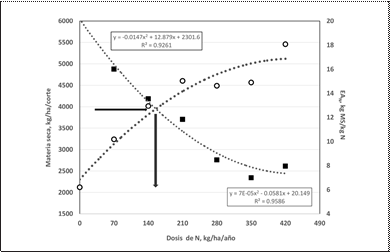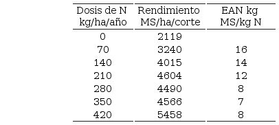 Para evaluar el efecto del N se corrió una regresión entre las dosis de N y la producción de MS y utilizando esta información se procedió a calcular la eficiencia agronómica de N (EAN) ( IPNI, 2012). La EAN es la cantidad de biomasa producida por cada kg de N aplicado de acuerdo con la siguiente fórmula: