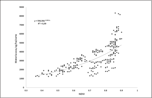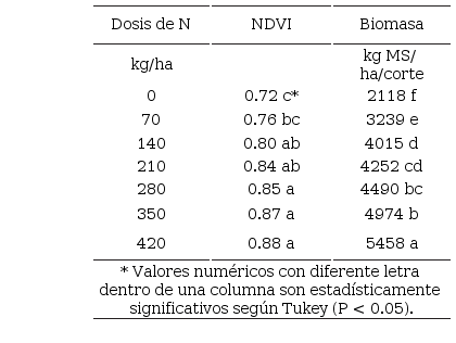 En trabajos realizados para medir la respuesta al N en la producción de semilla en raigrás perenne en Nueva Zelanda ( Chynoweth et al., 2010 ) se observó que el mejor rendimiento de biomasa de raigrás se obtuvo con las dosis entre 130 y 170 kg N/ha/año, con una producción de semilla entre 1500 y 2000 kg7ha y un NDVI de 0,8. Además, se observó que la fertilización con las dosis menores de N disminuía el NDVI y que las dosis superiores no lo aumentaban. Estos resultados son muy similares a los obtenidos en esta investigación ( Tabla 6).