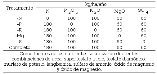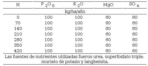 En el experimento de N se utilizaron dosis de este nutriente ( Tabla 2) y cada uno de los tratamientos recibió una cantidad complementaria de fósforo (P), potasio (K), magnesio (Mg) y azufre (S) para que estos nutrientes no limiten el rendimiento y permitan observar adecuadamente el comportamiento de N.